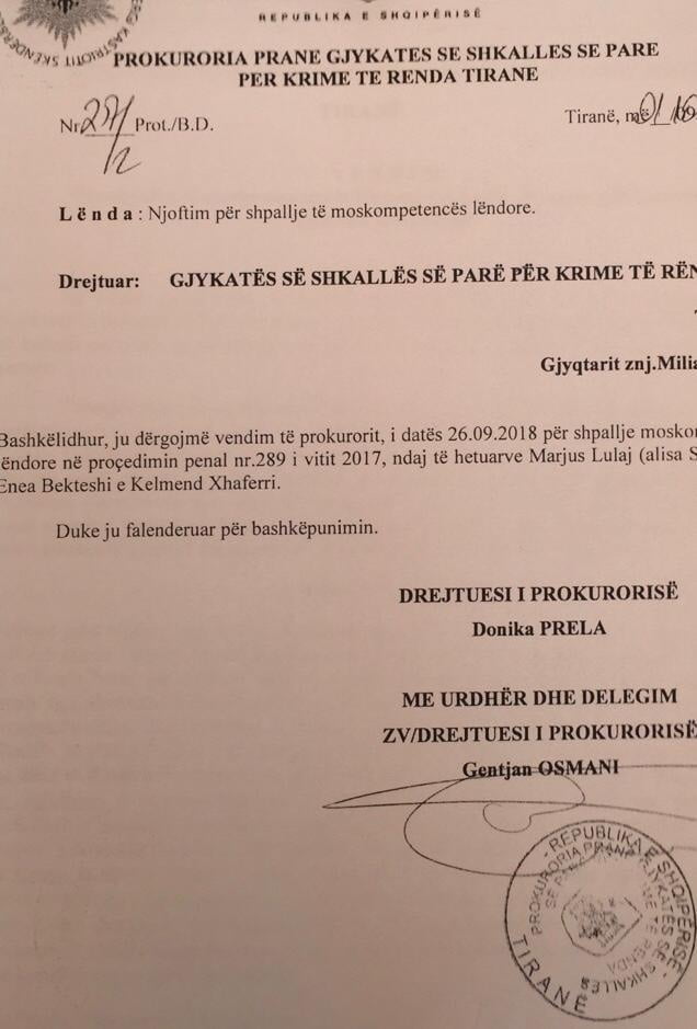 Prokurori Gentian Osmani me anë të një shkrese zyrtare të drejtuar Gjykatës së Shkallës së Parë për Krimet e Rënda, ka njoftuar se nuk ka kompetencë për të hetuar Marjus Lulajn, Enea Bekteshin dhe Klemend Xhaferrin.