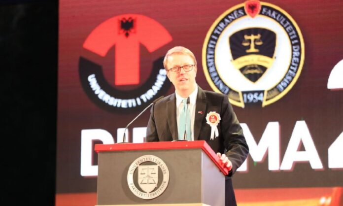 Mesazhi numër dy, Shtetet e Bashkuara janë të gatshme t’ju mbështesin. Amerika do të qëndrojë krah çdo personi që angazhohet për ndërtimin e një Shqipërie që është e drejtë dhe e lirë – për të gjithë shqiptarët. Pavarësisht profesioneve tuaja apo politikave tuaja. Nëse qëndroni për drejtësinë, ne, Shtetet e Bashkuara të Amerikës, do të qëndrojmë krah jush. Për të gjithë ata që do të bëhen juristë, Shtetet e Bashkuara do t’ju mbështesin gjithmonë për aq kohë sa kontribuoni për një sistem gjyqësor transparent, të ndershëm dhe etik. Përkushtimi ynë ndaj këtyre parimeve dhe atyre që i mbrojnë ato, nuk do të lëkundet dhe nuk do të dobësohet kurrë. Jua premtojmë këtë!