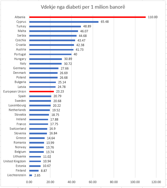 Të dhënat e Eurostat për normën e vdekjeve të shkaktuara nga diabeti tregojnë se vendet e Europës Juglindore janë më të prekura. Vendi me normën më të lartë pas Shqipërisë për vdekjet nga diabeti është Qipro, ku në 2015-n llogariteshin 65 vdekje për 1 milion banorë. Pas Qipros renditet Turqia me 49 vdekje për 1 milion banorë, Malta me 46 për 1 milion dhe Serbia me 44 për 1 milion banorë (shiko grafikun).