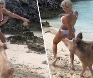 Një derr ndoqi pas një modele fitnesi, ndërsa ajo relaksohej në një plazh në pushime. Michelle Lewin po kalonte pushimet në plazhin e Bahamas, kur derri e ndoqi pas dhe e kafshoi në të pasme. Modelja venezueliane ishte duke ecur përgjatë rërës duke u xhiruar, kur derri nisi sulmin e saj. Ndërsa ajo u kthye në plazh, grupi prej katër derrash shkoi pas saj. Ndiqeni videon për ta parë momentin.