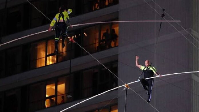 Çifti i akrobatëve eci nëpër një kavo çeliku që varej në lartësi 396 metra, e cila ishte e fiksuar në paretet e dy gradaçelave me 25 kate secila.