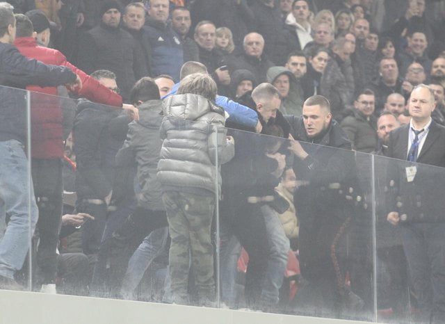 Gjatë zhvillimit të ndeshjes së futbollit janë kryer veprime të dhunshme nga tifozët, janë hedhur sendet të forta në fushën e lojës, janë dëmtuar stolat, si dhe janë futur në fushën e lojës gjatë zhvillimit të ndeshjes.