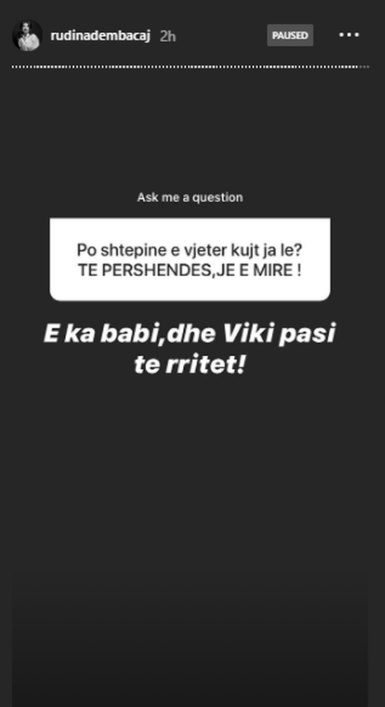 “Po shtëpinë e vjetër kujt ia le?”, i shkruan dikush. Rudina ka treguar se shtëpinë pas ndarjes e ka mbajtur Aleksi dhe kur të rritet Viki, shtëpia do të jetë dhe e saj.