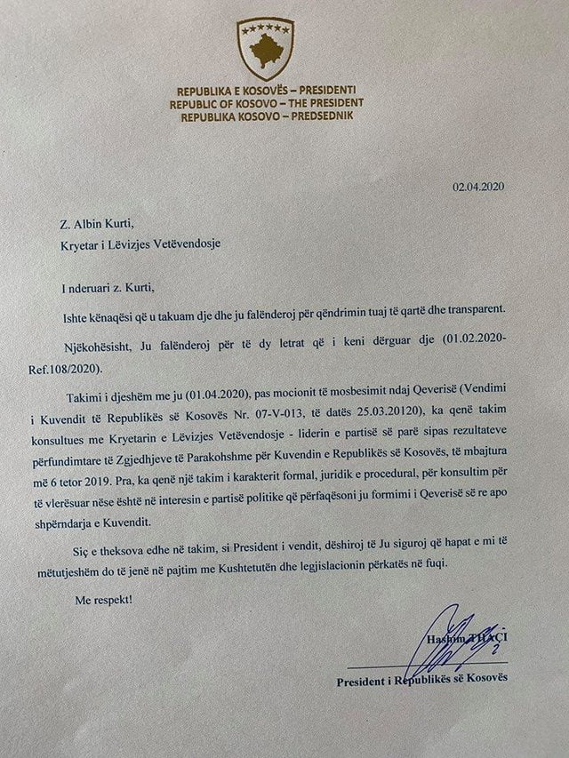 “Duke marrë parasysh Nenin 95 të Kushtetutës, Vendimin e Gjykatës Kushtetuese KO103/14, të datës 1 korrik 2014, dhe Vendimin e Komisionit Qendror të Zgjedhjeve për certifikimin e rezultateve përfundimtare të Zgjedhjeve të Parakohshme për Kuvendin e Republikës së Kosovës, të mbajtura më 6 tetor 2019 (Protokoll i KQZ-së nr. 1845-2029, 27.11.2019), Lëvizja Vetëvendosje, është subjekti politik që ka fituar shumicën në Kuvend për të formuar Qeverinë dhe ka të drejtën e propozimit të kandidatit të ri, për të formuar Qeverinë. Ju lutem, në emër të Lëvizjes Vetëvendosje, propozoni kandidatin e ri, të cilin do të mandatoj për formimin e Qeverisë së Republikës së Kosovës”, thuhet në shkresën zyrtare te presidentit Thaçi drejtuar Kurtit.