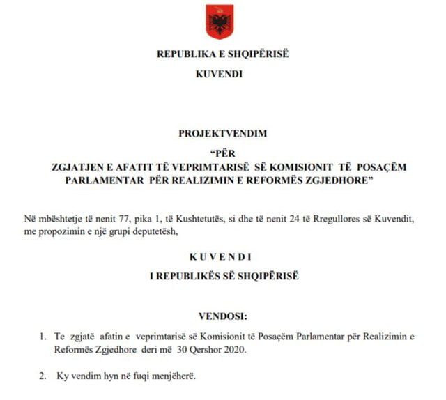 Gazeta ka mësuar se Këshilli Politik dhe Komisioni i Reformës Zgjedhore, i është drejtuar Kuvendi t të Shqipërisë me një shkresë, teksa kërkon shtyrjen e afatit për realizimin e reformës zgjedhore. Sipas një projekt vendimi, kërkohet të zgjatet afati i veprimtarisë së Komisionit të Posaçëm Parlamentar për Realizimin e Reformës Zgjedhore deri më 30 Qershor 2020. Sipas informacioneve, nga komisioni i reformës zgjedhore, i cili tanimë është pagëzuar me emrin “Këshilli Politik”, kërkesë për shtyrjen e afateve do të miratohet në seancën plenare që pritet të mbahet më 16 prill.