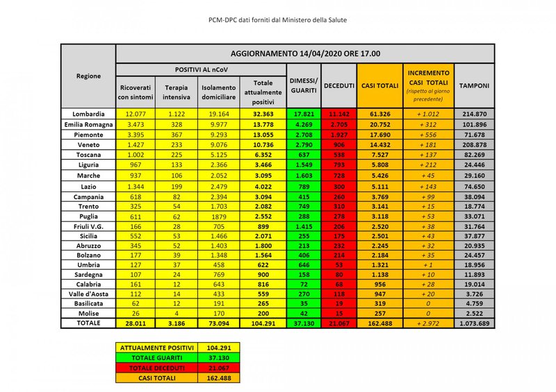 Ditën e djeshme Italia pati 104.291 të infektuar aktivë me një rritje minimale ditore prej 675 të infektuarish. Ndërkohë që vdekjet shkuan në 602 në ditë me një total prej 21,067 të vdekur. Numri i të shëruarve ditën e djeshme arriti në 37,130 persona me 1695 të shëruar në 24 orë.