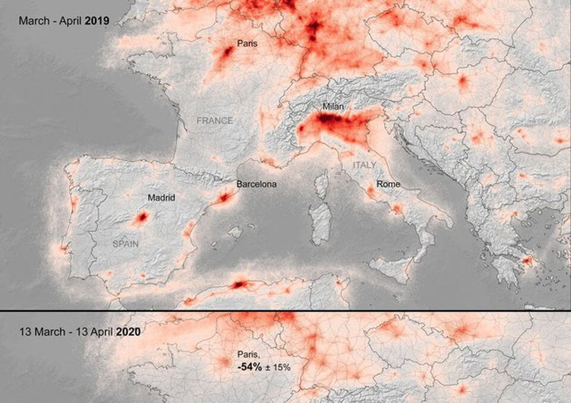 Përmirësimi i cilësisë së ajrit është veçanërisht i dukshëm në Itali, Spanjë dhe Francë, ku bllokimi ka qenë në vend për disa javë. Në Paris nga 13 marsi deri më 13 prill pati një rënie prej 54% të niveleve të dyoksidit të azotit në krahasim me të njëjtën periudhë të vitit të kaluar. Në Milano, Romë dhe Madrid rreth 45%.