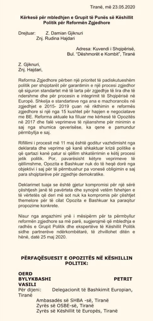 Letra mban firmën e përfaqësuesve të opozitës në tryezën e reformës, Oerd Bylykbashi dhe Petrit Vasili. Opozita sugjeron datën 25 maj, e hënë, për mbledhjen e Këshillit Politik.