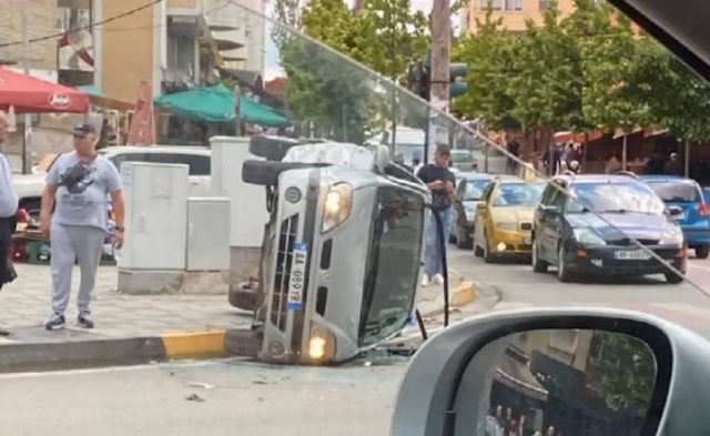 Dy makina u përplasën sot në rrugën “5 maji” në Tiranë. Si pasojë e përplasjes, njëra nga makinat është përmbysur.