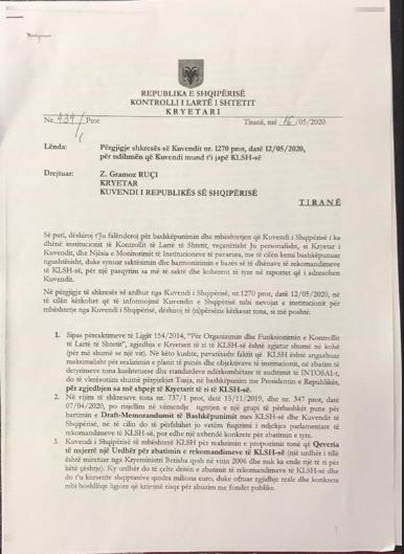 Por gazeta ka mësuar se ka qenë vetë kreu aktual, Bujar Leskaj, ai i cili ka kërkuar të zëvendësohet. Sipas burimeve nga Kuvendi, në zyrën e Ruçit kanë shkuar disa letra dhe e fundit mban datën16 maj. Në këtë letër, zoti Leskaj i shpreh shqetësimin zotit Ruçi që nuk po emërohet pasardhësi. “Sipas përcaktimeve të Ligjit 154/2014, “Për Organizimin dhe funksionimin e kontrollit të Lartë të Shtetit”, zgjedhja e Kryetarit të ri të KLSH-së është zgjatur shumë në kohë (për më shumë se një vit). Në këto kushte, pavarësisht faktit që KLSH është angazhuar maksimalisht për realizimin e planit të punës dhe objektivave të institucionit, në zbatim të detyrimeve tona kushtetuese dhe standardeve ndërkombëtare të auditimit të INTOSAI do të vlerësonim shumë përpjekjet Tuaja, në bashkëpunim me Presidentin e Republikës, për zgjedhjen sa më shpejt të Kryetarit të ri të KLSH-së”, thuhet në letrën e zotit Leskaj. Po ashtu ai ka pasur dhe disa kërkesa të tjera që po i paraqesim më poshtë.