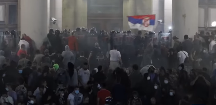 Përleshjet shpërthyen pasi një grup protestuesish u përpoq të hyjë në ndërtesën e Kuvendit të Serbisë, duke bërë që policia të hidhte gaz lotsjellës për të shpërndarë turmën.