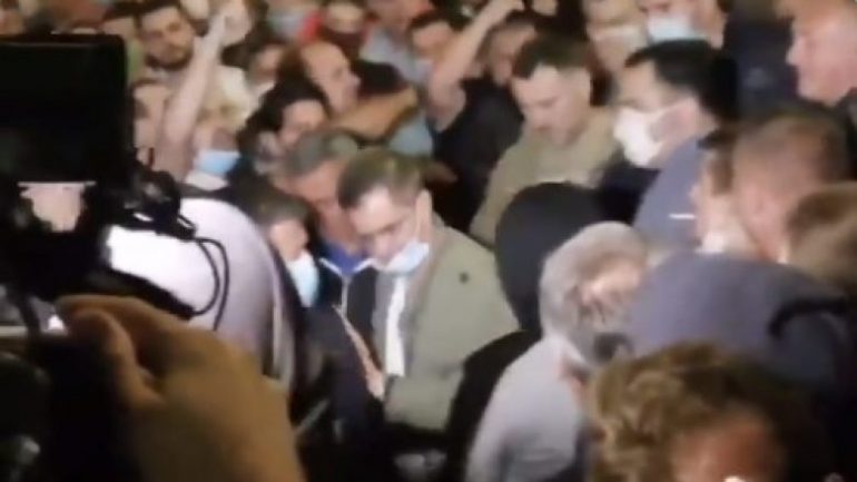 Kur ai po largohej i shoqëruar nga disa persona, protestuesit e zemëruar filluan ta godasin me shuplaka në qafë, duke ia bërë me dije se nuk i gëzohen prezencës së tij.