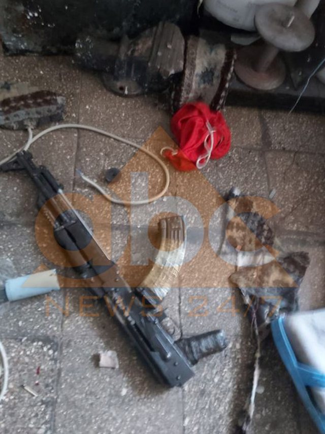 Në foto duken 5 kallëpe tritoli me nga 200 gr secila të bërë gati me kapsolla vetëm sa për t’u ndezur, ndërsa një kallëp e kishte hedhur në drejtim të RENEA-s, por fatmirësisht ka shpërthyer pjesërisht, pasi nuk ishte vendosur mirë. Në foto duket trupi i tij përtokë, pasi u ekzekutua nga RENEA dhe automatiku me dy karikatorë me të cilën qëlloi disa herë në drejtim të policisë.
