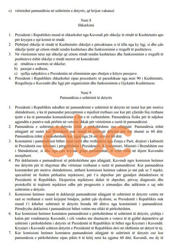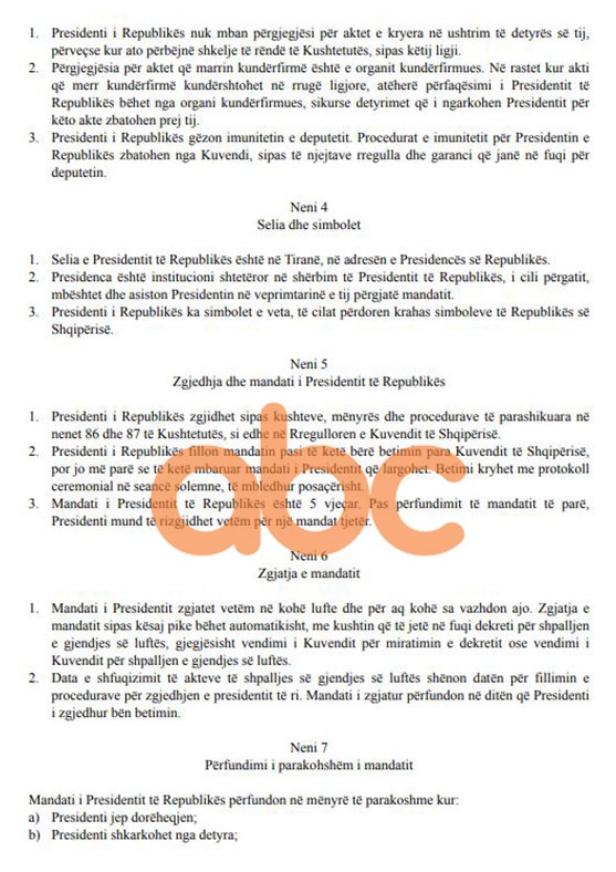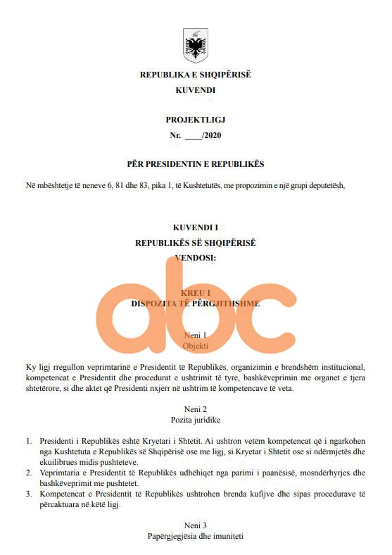 Gazetarja e ABC Esiona Konomi ka siguruar ekskluzivisht projektligjin për Presidentin e Republikës, në të cilin parashikohen disa ndryshime që i lenë të drejtat presidentit kompetencat që ka, por e kufizojnë veprimin e tij përmes përcaktimit të afatave kohore, brneda të cilave ai duhet të reagojë.