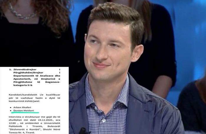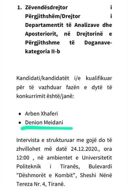 Denion Meidani, djali i ish-presidentit Rexhep Meidani ka konkuruar dhe ka kaluar në fazën e dytë për të marrë postin e Zv.Drejtor i Përgjithshëm/Drejtor i Departamentit të Analizave dhe Aposteriorit në Drejtorinë e Përgjithshme të Doganave.