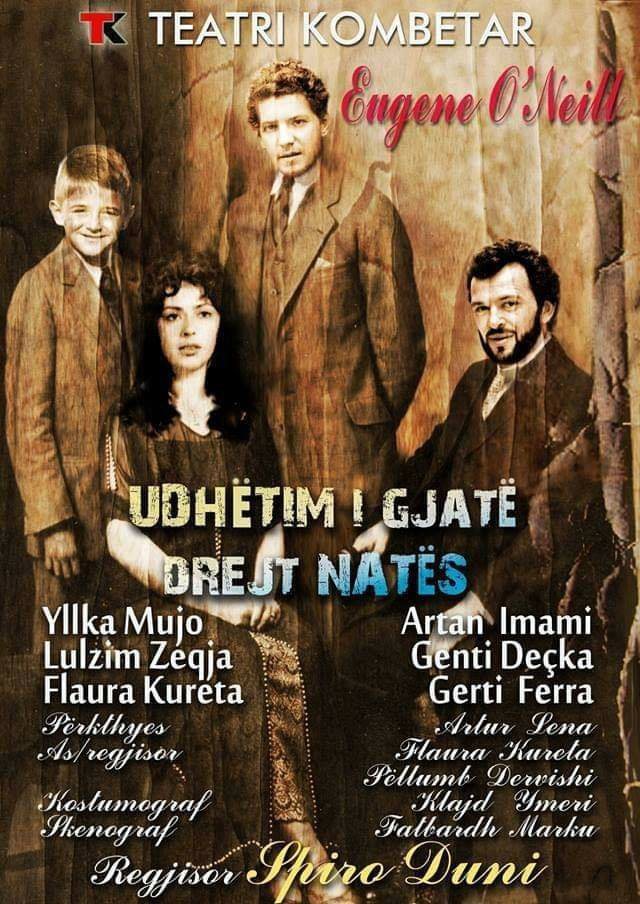 Vepra e shkrimtarit irlandezo-amerikan e vlerësuar me çmimin “Pulitzer” është një dramë me katër akte. Regjisori Spiro Duni ka bërë zgjedhjet e tij në role, ku janë emra të njohur të teatrit, ndërsa në dy rolet kryesore janë dy aktorët e karrierës Yllka Mujo dhe Artan Imami, që do të skalisin personazhet kryesore të dramës “Udhëtim i gjatë drejt natës”, e cila ishte në skenën shqiptare për herë të parë në 2014. Ylla Mujo vjen para publikut në rolin e Mary-t dhe Artan Imami në rolin e bashkëshortit të Mary-t, James. Por në kastën e aktorëve nuk mungon dhe Lulzim Zeqja një nga emrat që ka spikatur gjatë kësaj kohe në skenën e teatrit me rolet e tij, dhe këtë herë regjisori Duni i ka besuar rolin e Xhejm, ndërsa kastit të aktorëve i bashkohen dhe Flaura Kureta, Genti Deçka dhe Gert Ferra. Eugen O’Neill lindi më 16 Tetor 1988 dhe u nda nga jeta më 27 Nëntor 1953. Vepra dhe krijimtaria në dramë e O’Neill-it, e bëri botën që të kthente sytë drejt skenës dhe teatrit amerikan dhe ju hapi rrugën dramaturgëve të tjerë si: Clifford Odets, Arthur Miller, Tennese Williams dhe Edward Albee. Eugen Gladstone O’Neill është laureati i parë amerikan fitues i çmimit “Nobel”, më 1936. Dramat e tij të titulluara poetikisht ishin nga të parat që prezantuan teknikat e realizimit të dramaturgjisë amerikane në të njëjtën kohë me dramaturgun rus Anton Cehov, norvegjezin Henrik Ibsen dhe suedezin August Strindberg. Dramat e tij ishin ndër të parat në gjuhën e folur amerikane, duke përfshirë të gjithë personazhet e të gjitha llojeve të shoqërisë, me të mirat e të këqijat, me shpresën e aspiratat e tyre, mes zhgënjimit dhe dëshpërimit, groteskes e farsave sociale, jetës e vdekjes.