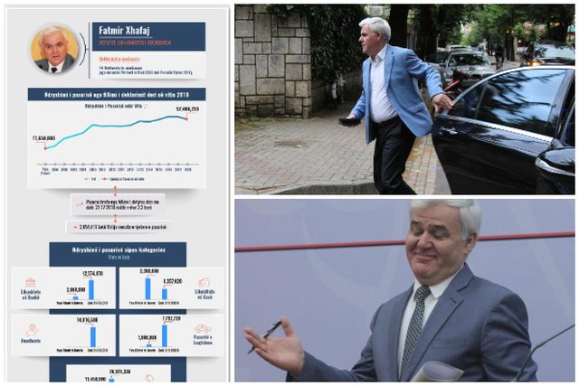 Në deklaratën e dorëzuar në ILDKPKI në vitin 2003, Fatmir Xhafaj deklaronte pasuri familjare prej 17.6 milionë lekësh, ndërsa në fund të vitit 2018, pasuria familjare është rritur me 3 herë dhe kap vlerën e 57.4 milionë lekëve.