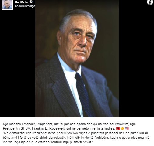 Presidenti i Republikës së Shqipërisë, Ilir Meta ka cituar një shprehje të Presidentit të SHBA, Franklin D. Roosvelt teksa sot shënohet përvjetori i lindjes së këtij të fundit.
