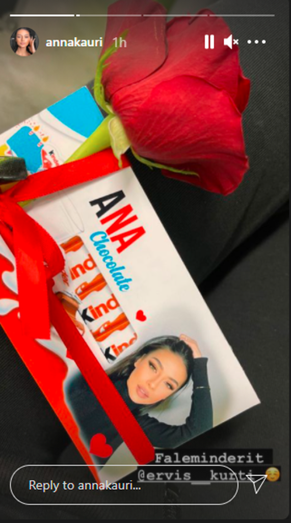31-vjeçari Ervis Kurti i ka dhuruar një çokollatë me emrin dhe fytyrën e saj, së bashku me një trëndafil të kuq.