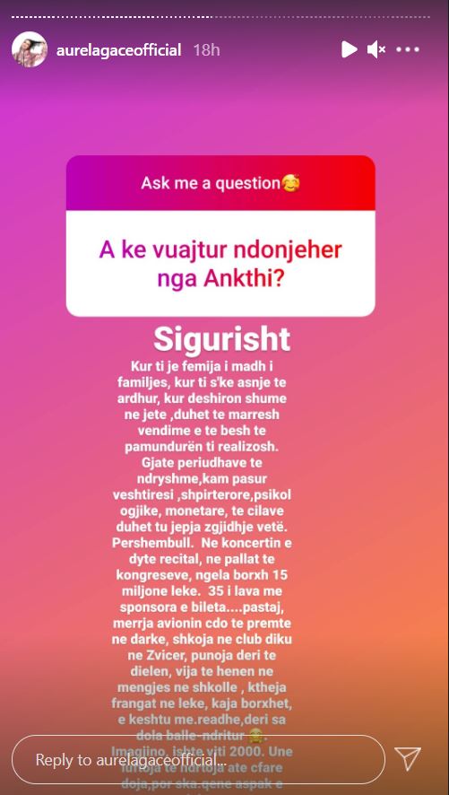 “Sigurisht. Kur ti je fëmija i madh i familjes, kur ti s’ke asnjë të ardhur, kur dëshiron shumë në jetë, duhet të marrësh vendime e të besh të pamundurën t’i realizosh. Gjatë periudhave të ndryshme, kam pasur vështirësi shpirtërore, psikologjike, monetare, të cilave duhet t’u jepja zgjidhje vetë. Për shembull: Në koncertin e dytë recital, në Pallat të Kongreseve, ngela borxh 15 milionë lekë. 35 i lava me sponsora e bileta… pastaj merrja avionin çdo të premte në darkë shkoja në klab diku në Zvicër, punoja deri të dielën, vija të hënën në mëngjes në shkollë, ktheja frangat në lekë, laja borxhe kështu me radhë derisa ja dola ballë-ndritur. Imagjino ishte viti 2000. Unë luftoja të ndërtoja atë çfarë doja, por s’ka qenë aspak e lehtë”– rrëfeu këngëtarja.