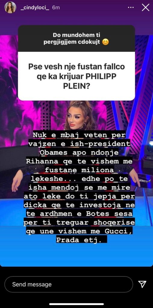 Sindi ka zhvilluar një “intervistë virtuale” me ndjekësit e saj dhe dikush e ka pyetur përse vesh një fustan fallco të krijuar nga Philip Plein. Sindit nuk i ka shpëtuar kjo pyetje dhe ajo i është kthyer keq personit në fjalë.