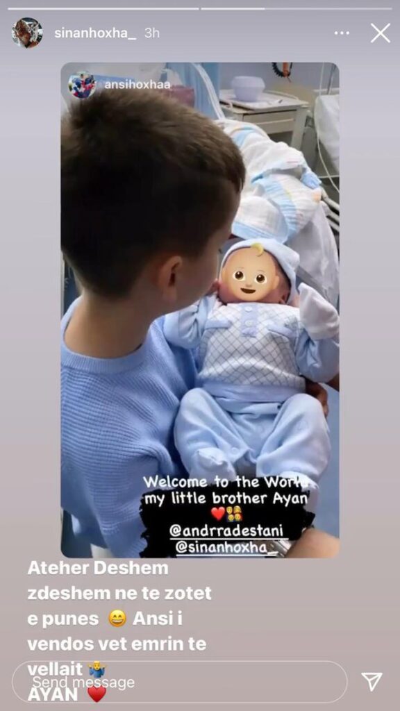 Sinani ka treguar se djali i tyre i madh, Ansi vendosi se si do të quhet i vëllai. “Atëherë deshëm s’deshëm ne të zotët e punës, Ansi i vendos vetë emrin të vëllait”, ka shkruar këngëtari krahas një fotoje të Ansit me të porsalindurin.