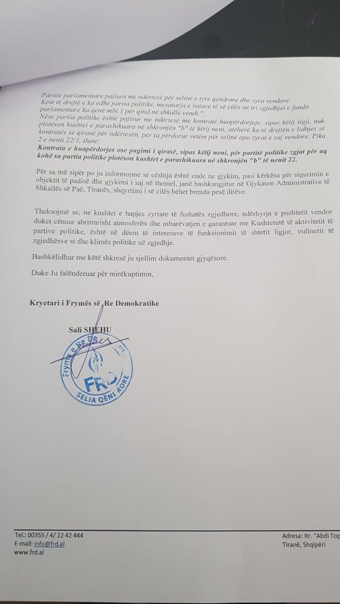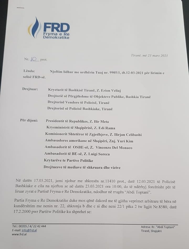 Letra në fjalë është bërë pas kërkesës nga ana e bashkisë, për lirimin e godinës ku qëndron FRD-ja.