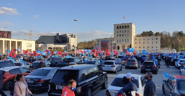 Mbështetësit e PD janë mbledhur në shesh me makina, ndërsa nuk mungojnë flamujt e shumtë blu.