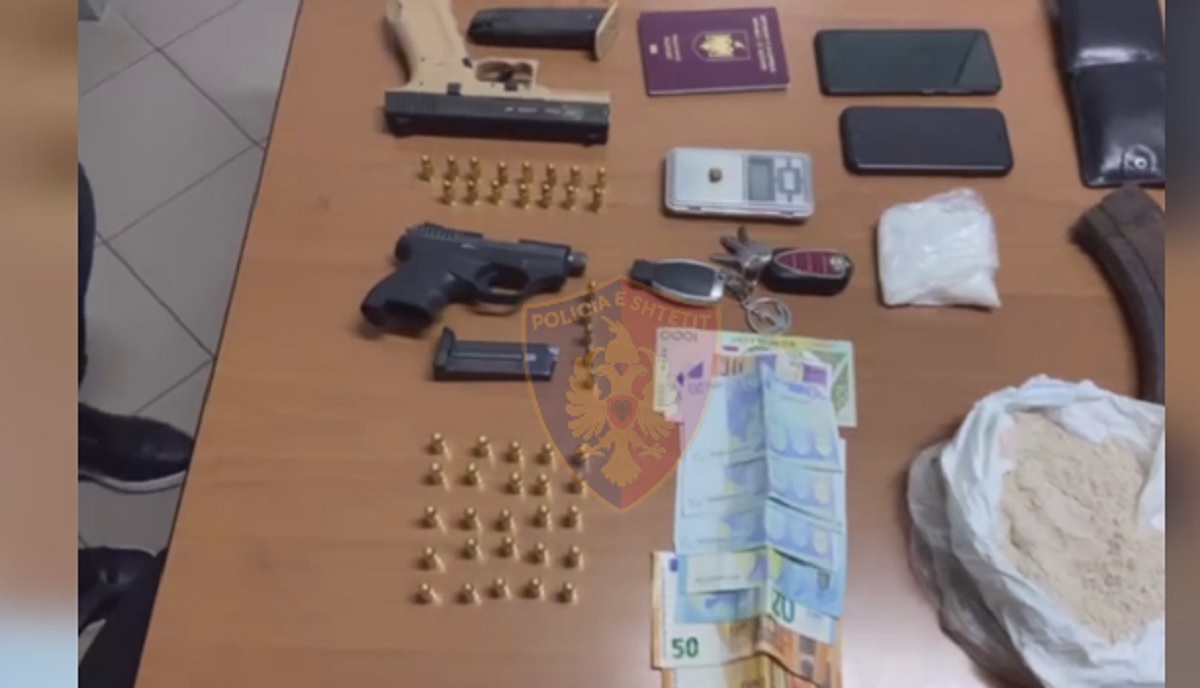 Gjatë kontrollit të banesës së shtetasit V. Gj. u gjetën dhe u sekuestruan 2 armë zjarri pistoletë, një sasi më lëndë narkotike kokainë dhe heroinë, një sasi municioni luftarak dhe sende të tjera të kundërligjshme.