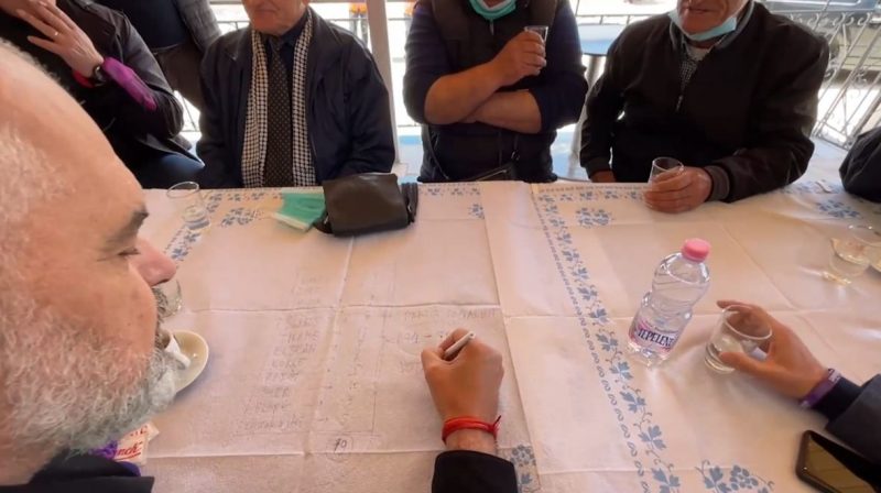Pasi shijoi ison e grupit polifonik, Rama u ul në një lokal aty pranë, ku bëri edhe parashikimet e zgjedhjeve të 25 prillit. Parashikimet Rama i shkroi në një mbulesë tavoline dhe doli në rezultatin se PS do të marrë 74-78, ndërsa nuk kanë munguar “thumbat” për presidentin Ilir Meta.