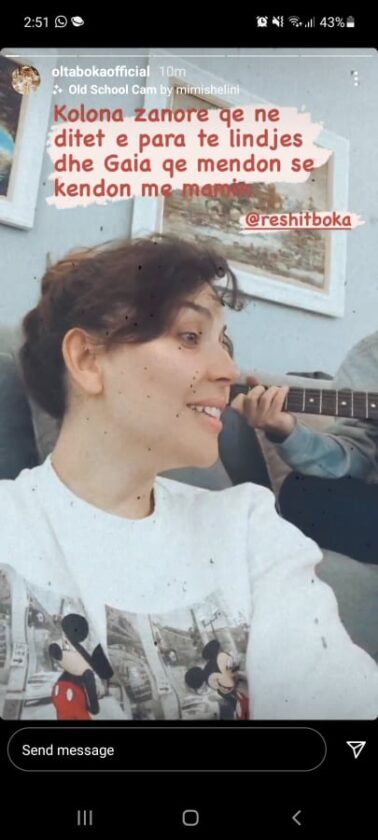 Në videon e publikuar në Instagram Olta dëgjohet duke kënduar këngën e famshme të Elvis Presley “Can’t help falling in love”. Gaia e dëgjon mamin me shumë vëmendje dhe herë pas here e shoqëron duke belbëzuar. Këtë moment të këndshëm, Olta e ka ndarë me gjithë ndjekësit dhe përkrah videos ka shkruar: “Kolona zanore që në ditët e para të lindjes dhe Gaia që mendon se këndon me mamin”.