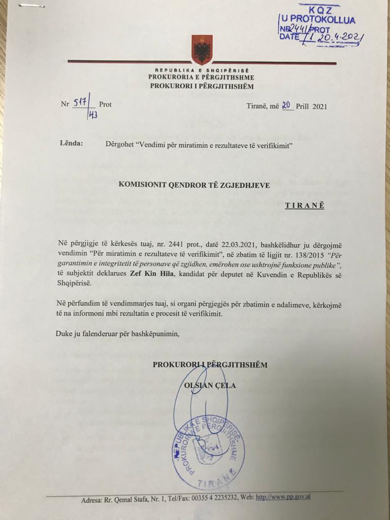 Tiranë, 20 prill 2021. Prokuroria e Përgjithshme në zbatim të ligjit nr. 138/2015 “Për garantimin e integritetit të personave që zgjidhen, emërohen ose ushtrojnë funksione publike”, Vendimit nr. 17/2016 të Kuvendit të Republikës së Shqipërisë, si dhe urdhrit të Prokurorit të Përgjithshëm nr. 41, datë 11.02.2020 përfundoi verifikimin për 1 (një) subjekt vetëdeklarues, kandidat në zgjedhjet parlamentare të 25 prillit dhe ia përcolli organit kompetent, në këtë rast Komisionit Qendror të Zgjedhjeve rezultatet e verifikimit (në zbatim të nenit 12 e 13 të Kreut V të Vendimit të Kuvendit nr.17/ 2016), për të shqyrtuar nëse janë evidentuar të dhëna që përfshihen në sferën e kufizimeve të nenit 2 të ligjit nr. 138/2015 dhe në vijim dhe të vlerësojë nëse ato janë brenda periudhës së ndalimit të përcaktuar në nenin 4 të po këtij ligji.
