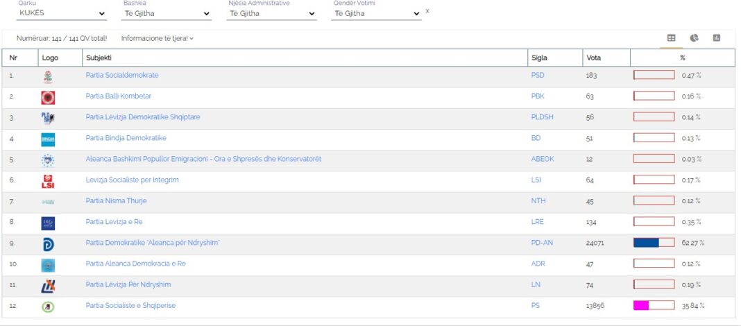 Nga 3 mandatet e Kukësit 2 i merr Partia Demokratike dhe 1 e merr Partia Socialiste.