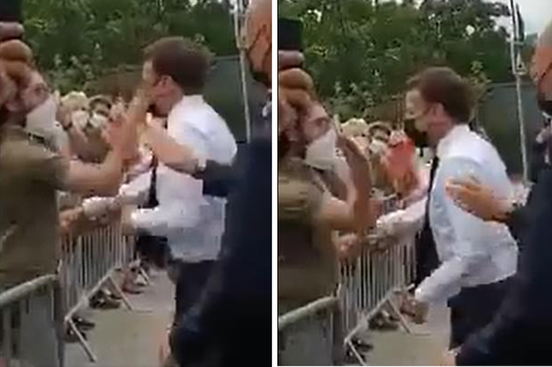 Damien Tarel me flokë të gjatë dhe me syze u hodh në tokë nga truprojat pasi goditi presidentin dhe bërtiti: ‘Montjoie Saint Denis’, një britmë e vjetër e luftës mbretërore, ‘A Bas La Macronie’ (‘Poshtë Macronia’).