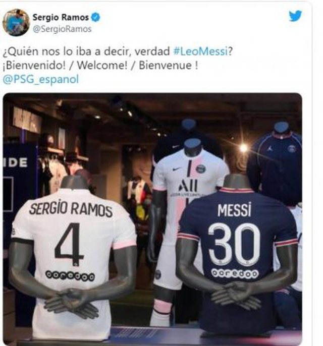 “Kush do ta besonte, Leo Messi?” Mirësevini! ” , shkroi qëndërmbrojtësi spanjoll në llogarinë e tij në Twitter , e shoqëruar me një fotografi të fanellave të dy