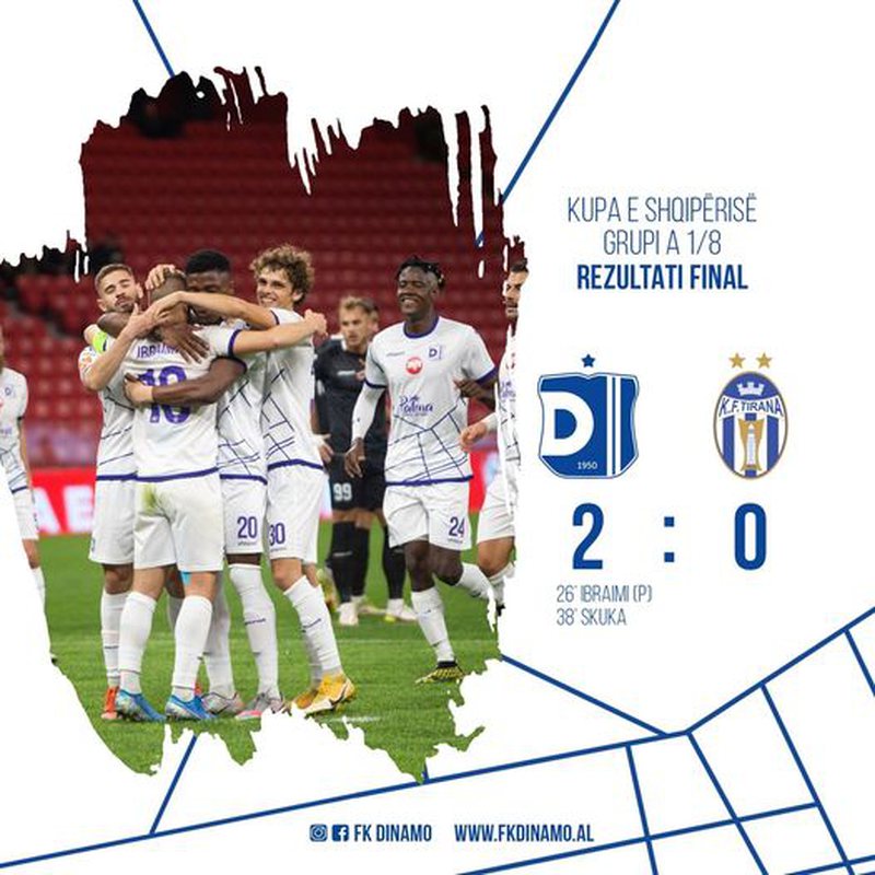 Derbi Dinamo-Tirana i luajtur dje në kuadër të xhiros së parë të turit të dytë të Kupës së Shqipërisë u fitua nga “nëndetësja” me rezultatin e pastër 2-0, një fitore spektakolare po të mendohet pathyeshmëria e Tiranës gjatë javëve të fundit. Më në fund, Dinamo jo vetëm e thyen, por i kujton Tiranës se në Kupë dinamovitët duan trofeun, i cili është i barazvlershëm me pjesëmarrjen direkte në Ligën e Konferencës të sezonit të ardhshëm. Ndeshja e djeshme midis dy rivalëve kryeqytetas u luajt për raundin e 1/8-ve të Kupës së Shqipërisë. Ekipi i trajnerit Bledi Shkëmbi realizoi dy gola në pjesën e parë. Agim Ibraimi zhbllokoi takimin me një penallti të kthyer në gol (26’), teksa Xhulio Skuka dyfishoi në fundin e fraksionit të parë. Bardheblutë tentuan të shënonin një gol shprese në pjesën e dytë, por nuk ia dolën dot. Dinamo menaxhoi mirë avantazhin e dyfishtë dhe siguroi një sukses tepër të rëndësishëm, sidomos në aspektin moral. E veçanta tjetër mbiu këtë përplasje interesante dhe domethënëse për fatet e sezonit është se ky derbi do të përsëritet edhe dy herë të tjera këto ditë. Në fundjavë zhvillohet përballja për javën e tetë të Superiores, ndërsa më pas, dy skuadrat e kryeqytetit do përballen për sfidën e kthimit në Kupë.
