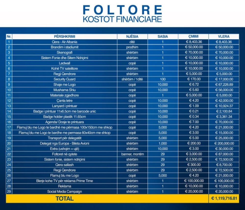 Gazeta “TemA” ka siguruar faturën financiare e cila shkon mbi 1 milion euro shpenzime.