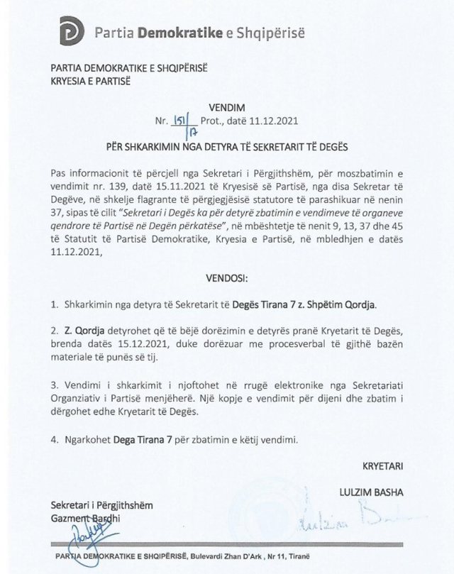 Mësohet se Lulzim Basha ka lëshuar një urdhër shkarkimi për Sekretarin e degës 7 në Tiranë, Shpëtim Qordja, i cili mban datën 11 dhjetor 2021, ditë kur zhvillonte punimet Kuvendi Kombëtar i rreth 5 mijë delegatëve.