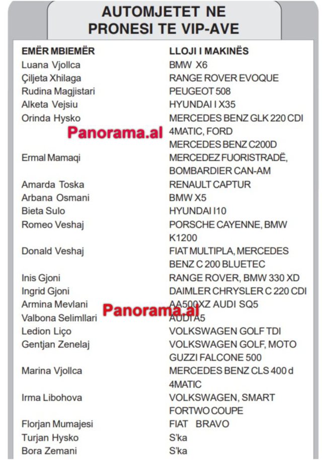 Kështu, Luana Vjollca këngëtare dhe moderatore ka në pronësi një “BMW X6” ngjyrë të kuqe, e cila ka një çmim që varion nga 65 mijë deri në 100 mijë euro. Ndërsa motra e saj, Marina Vjollca ka në pronësi një “Mercedes Benz CLS400 D 4MATIC”, që në treg arrin një çmim deri në 150 mijë euro. Ndërkohë Çiljeta Çilaga ka në pronësi një “Range Rover”-i “Evoque” me çmim që arrin nga 50 mijë euro deri në 150 mijë euro. Orinda Hysko, moderatorja e njohur ka në emër të saj tre makina të regjistruara dhe një prej tyre është një “Mercedes Benz GLK 220 CDI 4matic”, vlera e të cilit në treg arrin deri një 130 mijë euro. Arbana Osmani në këtë databazë ka të regjistruar në emrin e saj një “BMW X5”, e cila në treg arrin në një çmim deri në 60 mijë euro.