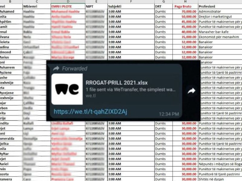 Kujtojmë se në dhjetor u publikua një listë me të dhënat e qytetarëve duke nisur nga emri, mbiemri, emri i plotë, nipti i subjektit, subjekti, profesioni dhe orari i punës. Lista e pagave, një dokument në formatin “Excel” qarkulloi në rrjet duke përbërë një shkelje flagrante të dhënave personale të qytetarëve. Prokuroria e Tiranës nisi hetimet ndaj Drejtorisë së Tatimeve dhe Institutin e Sigurimeve Shoqërore nga ku dyshohej se mund të kishte dalë informacioni. Lista e parë e publikuar i përkiste muajit janar ndërsa e dyta muajit prill 2021. Lidhur me këtë skandal reagoi edhe qeveria ku shprehej se ky informacion nuk kishte dalë nga Ministria e Ekonomisë pasi lista e publikuar nuk kishte të njëjtën paraqitje me dokumentin zyrtar që disponon ministria. Kujtojmë se Drejtori i Sistemit Informatik të Tatimeve dha dorëheqjen tre ditë pas rrjedhjes së të dhënave duke u vendosur në dispozicion të hetimeve. Ndërkohë pas procedimit penal për “Ndërhyrje në sistemet kompjuterike” dhe për “Shpërdorim Detyre”, Prokuroria e Tiranës mori në pyetje edhe 14 ekspertë të IT në institucionet: Drejtoria e Tatimeve, Instituti i Sigurimeve Shoqërore dhe Agjencia Kombëtare e Shoqërisë së Informacionit. Po ashtu organi i akuzës po kryen ekspertim edhe tek kompjuterët e specialistëve të Tatimeve dhe Agjencisë Kombëtare të Shoqërisë së Informacionit. Prokuroria ka vendosur sekuestro mbi serverët e tre institucioneve nga dyshohet se ka patur rrjedhje të dhënave. Gjithashtu është ngritur edhe një grup hetimor për të kryer hetimet përkatëse në Agjencinë Kombëtare të Shoqërisë së Informacionit po ashtu edhe në Drejtorinë e Tatimeve.
