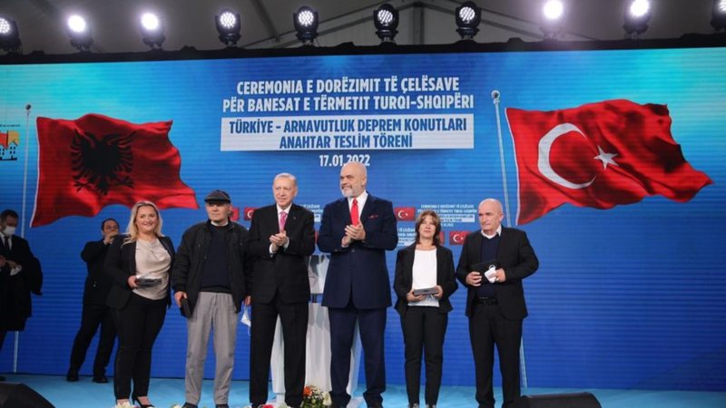 Zoti Erdogan u prit në aeroportin “Nënë Tereza” me nderimet më të larta nga kryeministri Edi Rama, me të cilin u drejtuan për në Laç, ku u përurua një kompleks pallatesh me 522 apartamente, në të cilat do të strehohen familjet e prekura nga tërmeti i nëntorit të vitit 2019.