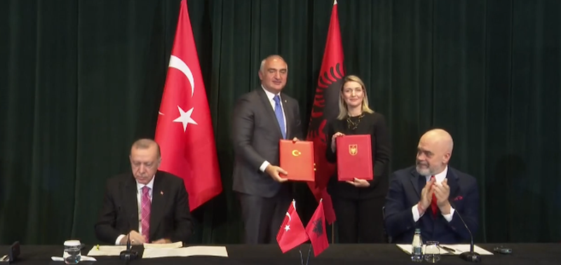 Po firmosen 7 marrëveshje bashkëpunimi midis Shqipërisë dhe Turqisë, të pranishëm janë edhe kryeministri Edi Rama e presidenti i Turqisë Recep Tayyip Erdogan.