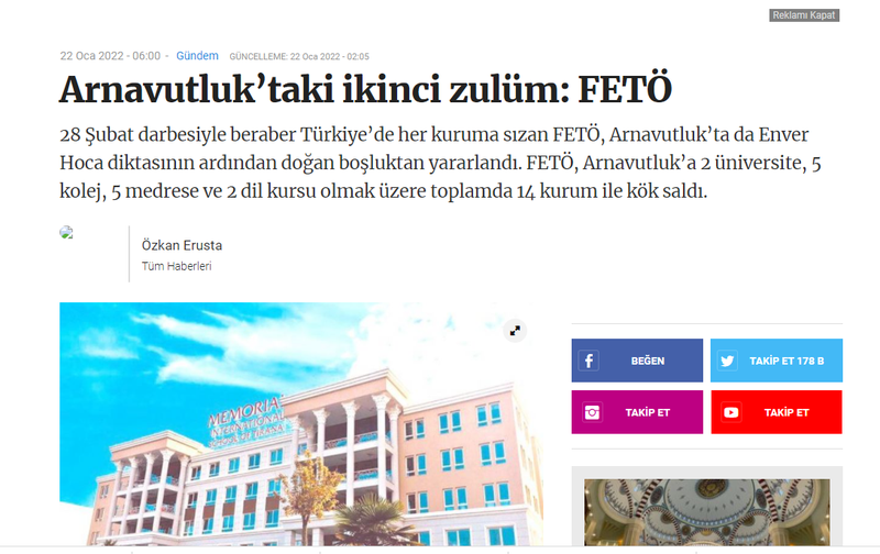Në listën e publikuar nga mediat, përfshihet edhe Spitali Amerikan, një portal dhe disa institucione të tjera për të cilat Erdogan ka dhënë ultimatum të mbyllen. “Turgut Özal është një nga organizatat ombrellë e shkollave të FETO në Shqipëri, e cila përfshin Universitetin Epoka, Kolegjin Turgut Özal në Tiranë, Kolegjin Turgut Özal në Durrës dhe Shkollën Ndërkombëtare Memoriale”, thuhet më tej në artikull. Në artikull theksohet se ka dhe portale dhe shtëpi botimi që Erdogan ka kërkuar të mbyllen, sepse janë të financuara nga Gylen. Madje akuzohet dhe Departamenti i Gazetarisë për mbështetje ndaj organizatës. “Duke kontrolluar Departamentin e Gazetarisë të Universitetit të Tiranës, anëtarët e FETO-s dominuan median duke punësuar në universitetet e tyre figurat më me ndikim në universitetet shtetërore”, thuhet më tej. Në artikull tregohet se të lidhura me FETO janë dhe organizata: Horizonte të Reja, ACITAD dhe Fondacioni SEMA. Po ashtu tregohet se si FETO ka hyrë në Shqipëri. “Anëtarët e FETO-s, hynë në vend me Fondacionin Gülistan që ata themeluan në vitin 1993, përfunduan Kolegjin Mehmet Akif në Tiranë në të njëjtin vit, Kolegjin Turgut Özal në Tiranë dhe Kolegjin Hasan Pasha në Shkodër në 2001. FETO-istët, hapën më pas Memorial International School of Tirana (MIST) në vitin 2001 për të vënë nën mbrojtjen e tyre fëmijët e pasur, duke ndikuar në biznesin, politikën dhe ekonominë e vendit”, thuhet më tej.