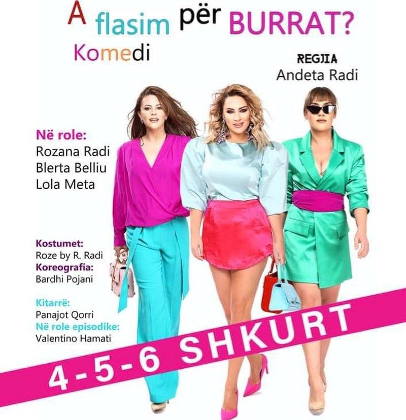 Komedia “A flasim për burrat?” nis udhëtimin këtë vit në skenën e Tiranës. Tre mikesha, secila me karakterin e saj të veçantë, punën dhe problemet e saj, të cilat bëjnë që të jenë tre personazhe të ndryshme me problematikat që sot i hasim çdo ditë. Ato takohen që të flasin me njëra-tjetrën për problemet e tyre, i tregojnë gjithçka njëra-tjetrës, i besojnë opinionit dhe mendimit të njëra-tjetrës dhe sigurisht, tema e preferuar e grave janë burrat. Komedia që mbushi sallat në vitin që lamë pas nga kërkesat e shumta, rikthehet në Tiranë në datat 4, 5 dhe 6 shkurt në Teatrin Kombëtar te “ArTurbina”. Me regji nga Andeta Radi, në role janë aktoret Rozana Radi, Belliu Blerta dhe Lola Meta. Komedia rikthehet këtë vit në skenën e Tiranës pas një suksesi më parë në skena të ndryshme si në teatrin e Korçës, tetarin e qytetit të Elbasanit, teatrit të Durrësit, etj, por nuk mungoi edhe në Gjakovë në festival të teatrit. E konceptuar si një komedi situatash që fton për reflektim dhe për të kuptuar më mirë njëri-tjetrin, aktoret Rozana Radi, Blerta Belliu dhe Lola Meta u duartrokitën në vitin që lamë pas edhe për ndërveprimin me spektatorët në salla, që solli mjaft të qeshura. Komedia, që spikat edhe për përzgjedhjen muzikore në funksion të së tërës, do të vijojë të shfaqet dhe gjatë këtij viti, ku aktorja Blerta Belliu thotë se pas Tiranës do të vijojë edhe në skena të tjera për publikun. “Ky rikthim në skenë i komedisë “A flasim për burrat?” vjen në skenë nga kërkesat që ka publiku. Komedia do të vazhdojë turin përsëri në qytete tjera”, thotë mes të tjerave aktorja Blera Belliu, pjesë e komedisë që për tre net me radhë do të jetë në skenën e “ArTurbinës” te Teatri Kombëtar.