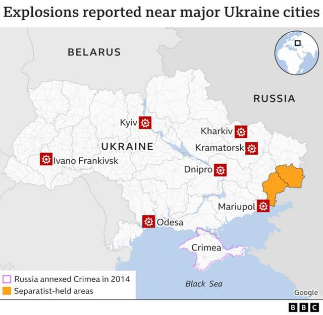 Pak çaste më vonë, u raportuan sulme ndaj objektivave ushtarake ukrainase. Ukraina tha se Rusia kishte nisur një “pushtim në shkallë të plotë”.
