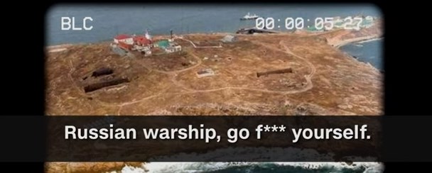 Dje një anije luftarake ruse iu afrua ishullit. Sipas shkëmbimit të supozuar audio, oficeri rus thotë: “Kjo është një luftanije ushtarake. Kjo është një luftanije ushtarake ruse. Unë ju sugjeroj të lini armët dhe të dorëzoheni për të shmangur gjakderdhjen dhe viktimat e panevojshme. Përndryshe, do të bombardoheni!”