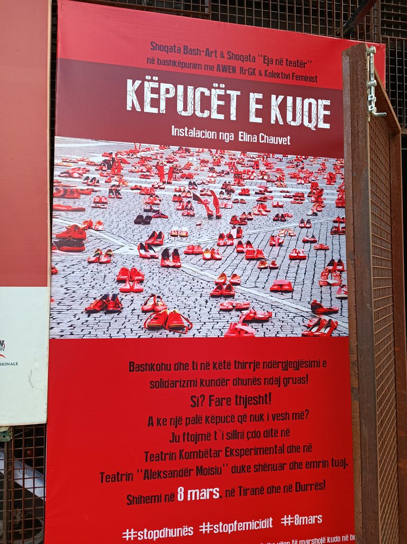 Instalacioni “Këpucët e kuqe” i artistes Elina Chauvet, më 8 mars në Durrës dhe Tiranë. Në Durrës te shkallët pranë galerisë së artit pamor “Nikolet Vasia”, si dhe përgjatë skulpturës “Vija e dritës” së artistit Ilirian Xhixha në sheshin “Liria”, ndërsa në Tiranë në sheshin “Skënderbej”. Teatri “Aleksandër Moisisu” më herët shprehej se ky instalacion është një thirrje ndërgjegjësimi e solidarizimi përballë një situate dhune kundrejt grave në Shqipëri e kudo në botë. “Këpucët e kuqe” nisi në qytetin e Juárez, Chihuahua Mexico. Në 22 gusht të vitit 2009 erdhi si një marshim për 33 gra të vrara, e vit pas viti këto hapa solidariteti janë shtuar, duke treguar mungesën dhe dhimbjen që këto vrasje sjellin në shoqëritë tona, e tashmë është kthyer në një marshim të madh solidariteti ndaj grave duke u përhapur nga Amerika në Evropë (Meksikë, Argjentinë, Itali, Spanjë, Mbretëri e Bashkuar, Suedi, Kili, Ekuador, Shtetet e Bashkuara, Kanada, Brazil,Paraguaji, Francë, Afrikë e shumë të tjerë. Më herët teatri i Durrësit bënte ftesë për tu bashkuar në këtë instilacion. “A ke një palë këpucë çfarëdolloj ngjyre, modeli a numri? Bashkohu dhe ti në instilacionin “Këpucët e kuqe” të artistes meksikane Elina Chauvet”, thuhej nga institucioni. Në vijim të aktiviteteve të marsit, në faqen e teatrit “Aleksandër Moisiu” në Facebook/Instagram/Youtube, më datë 8 një videomesazh sensibilizues “Vramë”, ku përveç aktoreve të teatrit janë bashkuar edhe aktoret Raimonda Bulku, Anila Bisha, autorja nga Prishtina Kaltrina Pacolli si dhe dy aktore të njohura dhe njëkohësisht dy drejtore të dy prej teatrove më të rëndësishëm në Shqipëri, e teatrit “Migjeni” në Shkodër Rita Gjeka dhe e teatrit “Andon Zako Çajupi” në Korçë, Zamira Kita. Më datë 9 mars do të jetë shfaqja “Gra të lira” me një kast aktoresh si Margarita Xhepa, Luiza Xhuvani, Raimonda Bulku, Olta Daku, Erjona Kakeli, Alessia Xhemalaj, etj, me regji nga Driada Dervishi, pjesë e “FemFest” festivalit të parë femëror të zhvilluar në Tiranë nga “BashArt”.