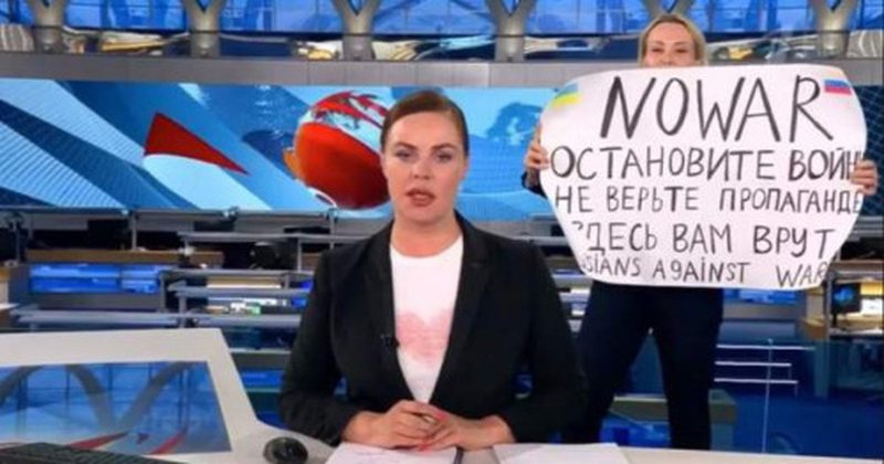 Një protestuese ka ndërprerë transmetimin e drejtpërdrejtë në televizionin shtetëror rus duke tundur një pankartë ku shkruhej: “Jo luftë, ndaloni luftën”.