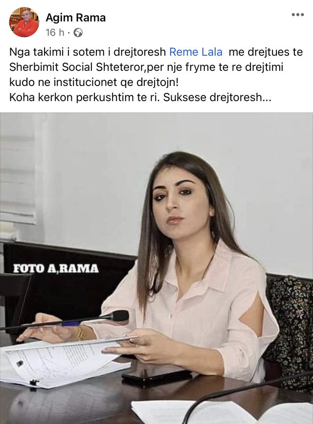 Lajmin e ka bërë me dije fotografi Agim Rama, i cili ka publikuar një foto të Lalës ku shkruan: “Me Reme Lalën, me drejtuesen e Sherbimit Social Shteteror, per nje fryme të re drejtimi”, shkruan Rama.