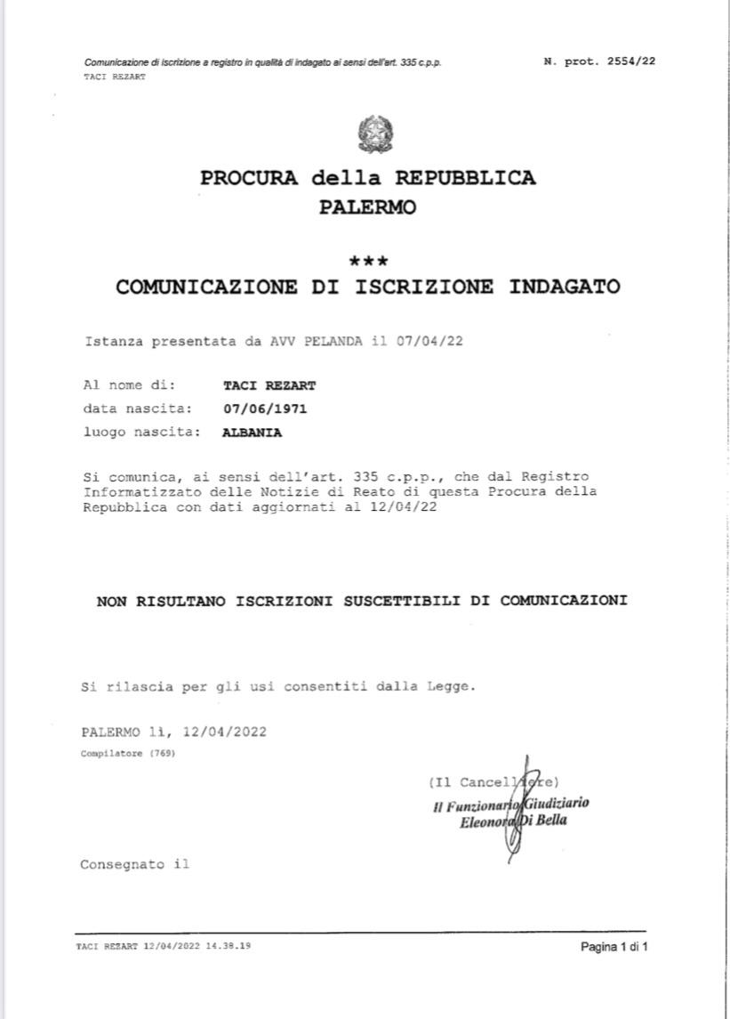 Burime te redaksise kane siguruar dy dokumente zyrtare te Prokurorise se Palermos qe nuk lene vend per interpretim, ndaj Rezart Tacit nuk ka akuze te ngritur si ne perfundim te hetimeve paraprake te nentorit 2021 ashtu dhe ne perfundim te hetimeve te marsit 2022 per kete ceshtje.